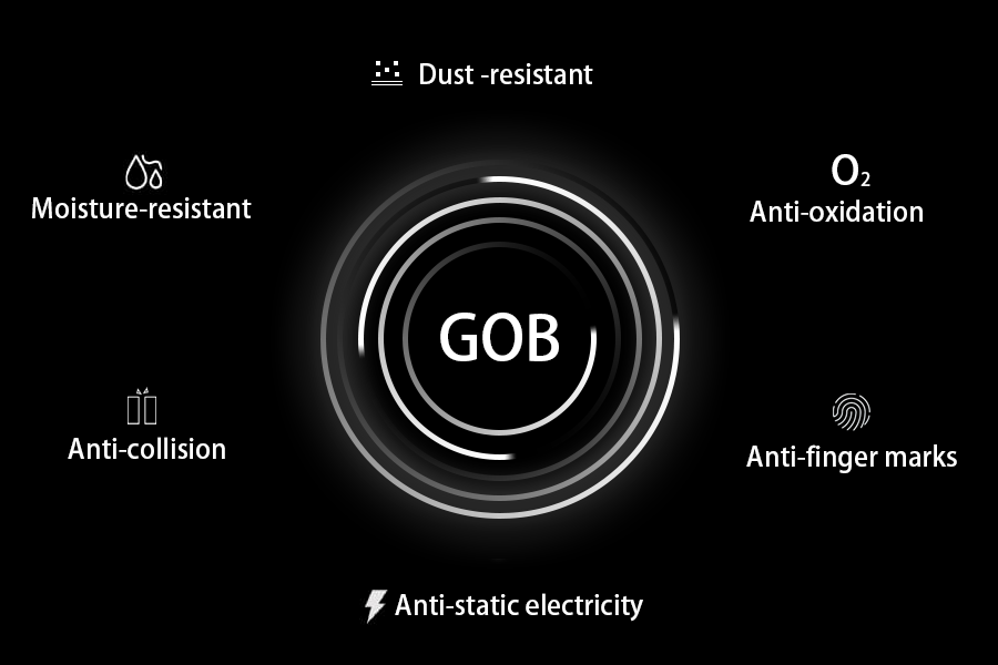 GOB, lớp phủ nano (tùy chọn kỹ thuật), màn hình LED trong nhà có khả năng bảo vệ cao, chống bụi, chống thấm nước, chống trầy xước, độ bền và độ tin cậy được nâng cao, có thể kéo dài tuổi thọ và MTBF của màn hình.